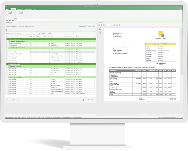Die Dateien werden verschlüsselt und unveränderbar in einer spezielle Archiv-Datenbank gespeichert, sind somit sicher vor fremden Zugriffen. Über die Suchfunktion der Benutzer- und Passwortgeschützen Oberfläche, lassen sich die archivierten Rechnungen anzeigen und bei Bedarf auch wieder problemlos exportieren. Auch Wiederherstellungsmöglichkeiten und die Generierung einer Prüfliste in Excel sind enthalten.